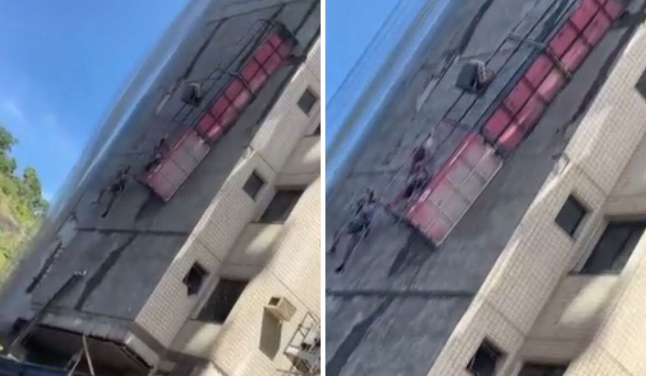 Foto: Reprodução TV Vitória Dois trabalhadores ficaram pendurados em um andaime, após a estrutura metálica que sustentava o equipamento ceder durante um serviço em Guarapari, no domingo (3). A ocorrência mobilizou equipes do Corpo de Bombeiros, que realizaram o resgate dos homens.