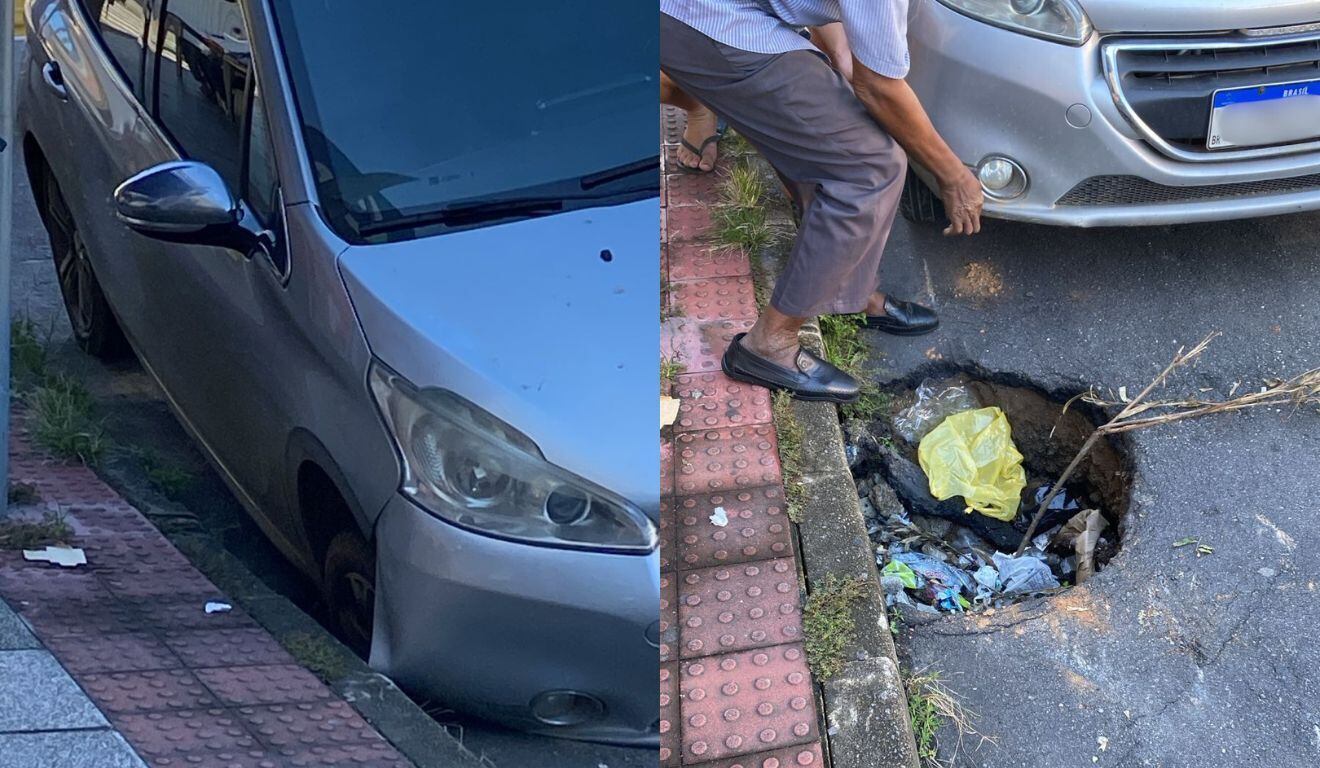 Carro fica preso após cair em buraco em rua de Laranjeiras