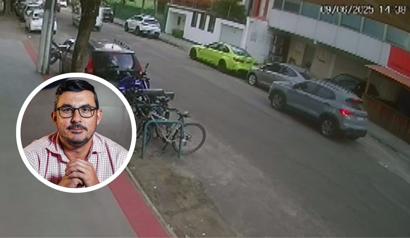 Imagem mostra o carro verde de Wallace Lovato (destaque) e o veículo cinza usado pelos criminosos. Foto: Videomonitoramento