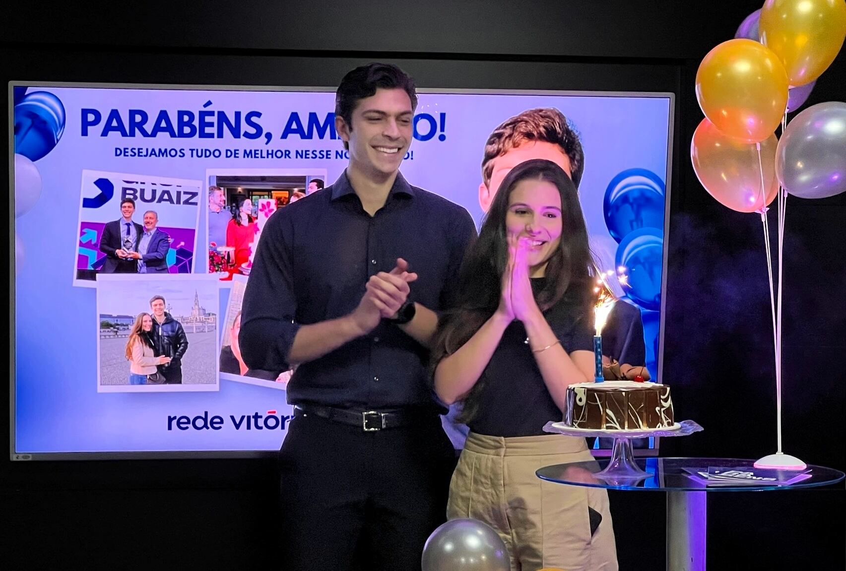 A tardinha de ontem foi marcado por uma comemoração muito especial, de surpresa, em torno do aniversário de uma pessoa muito querida que é Americo Buaiz Neto, vice-presidente da Rede Vitória. Tudo preparado com carinho pelos seus colegas, entre eles, Felipe Caroni, Davi Wescley e Alexandre Carvalho. Coordenando a festa, Marina Woelffel. Detalhe: Emily Varejão, namorada de Americo, que também celebra aniversário na mesma data, compareceu à surpresa e acabou sendo surpreendida junto com ele.