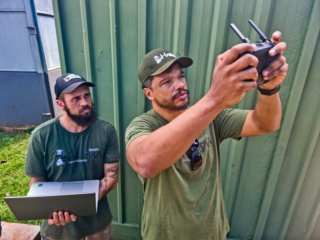 Professor Áureo Banhos e Paulo Quadros monitoram ninhos de harpia com drone | Foto: Leonardo Merçon/Instituto Últimos Refúgios Na Mata Atlântica capixaba, entre os atropelamentos nas estradas e os ninhos no alto das árvores, um pesquisador se destaca por sua paixão incansável: formar pessoas e proteger espécies ameaçadas.
