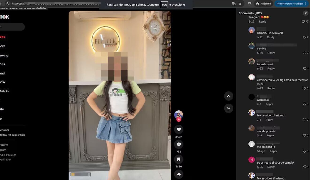 Vídeo de criança no Tik Tok tem mensagens com a palavra "cambio" no espaço de comentários, que indica pedido de troca de imagens de pedofilia Foto: REPRODUÇÃO A denúncia do youtuber Felca sobre a “adultização” de crianças nas redes sociais revelou o perigo por trás da fórmula secreta de distribuição de conteúdos pelo algoritmo das plataformas. Entre os casos extremos, está o do influenciador Hytalo Santos, preso esta semana sob acusação de lucrar com vídeos de exploração sexual infantil. Mas também há conteúdos aparentemente inocentes de crianças, muitas vezes publicados por mães e pais, que se tornam ponto de encontro de pedófilos e outros criminosos.