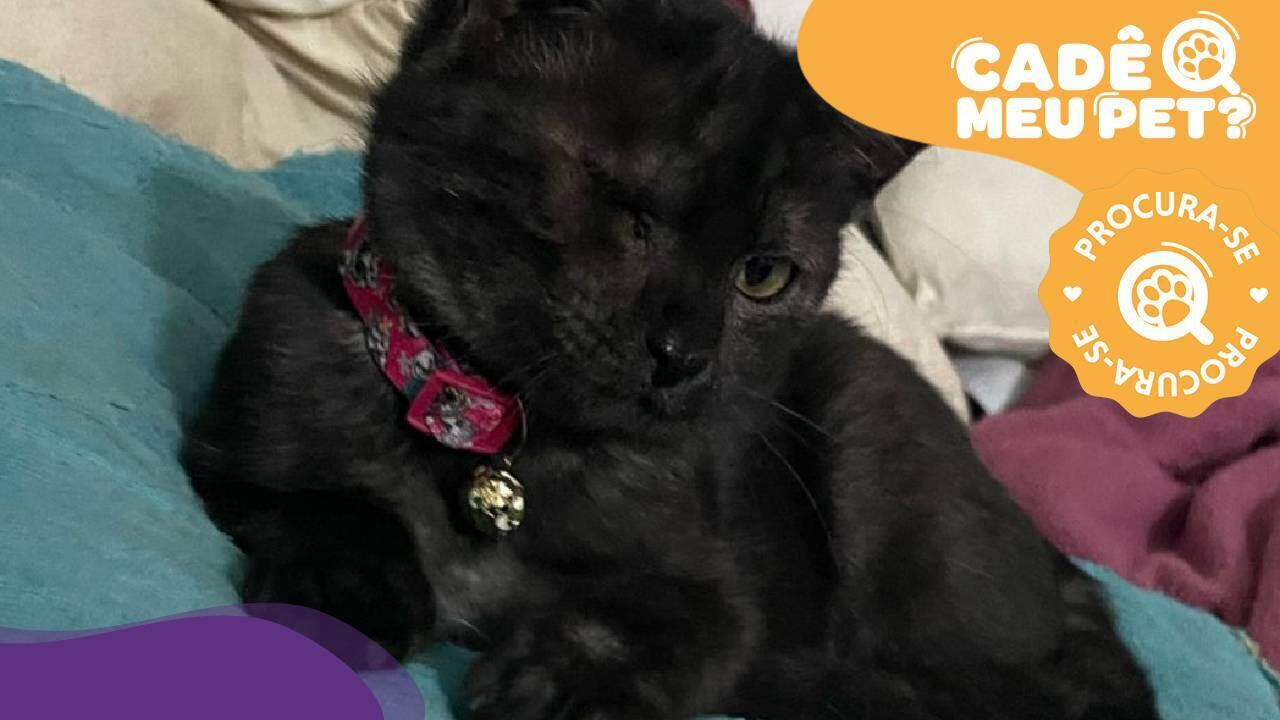Gata Kiki está desaparecida. (Foto: arquivo pessoal) Kiki é uma gata filhote sem raça definida, de pelagem preta com a raiz dos pelos brancos. Possui apenas um olho, o esquerdo, e estava usando uma coleira rosa no momento do desaparecimento.