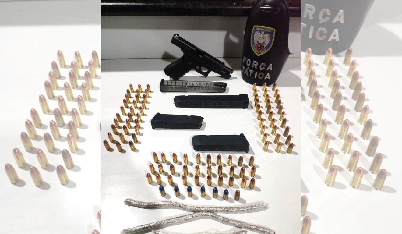 Foto: Divulgação/SespSuspeito foi preso na casa da filha. Com ele, a PM apreendeu pistola, carregadores, munições e buchas de maconha...