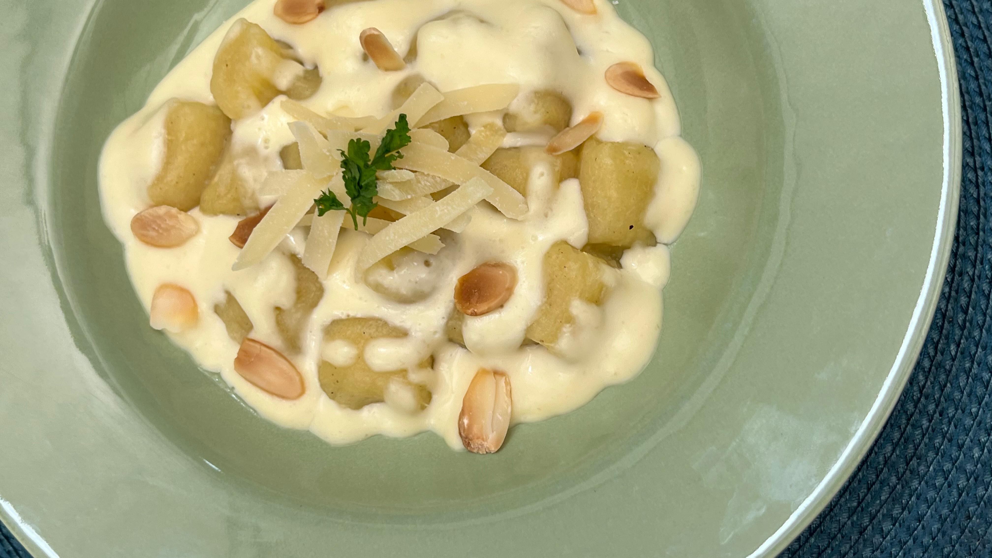 Nhoque Quatro Queijos. Foto: Roberta Salgueiro Maciez de nuvem, sabor aconchegante e cremosidade de sobra: o Nhoque aos Quatro Queijos da chef Rosana Neres prova que comfort‑food não precisa ser complicada. A receita une o nhoque caseiro feito com batata inglesa, parmesão ralado e um toque de noz‑moscada a um molho exuberante preparado com muçarela, provolone, parmesão e requeijão, finalizado com creme de leite para atingir a textura aveludada perfeita.