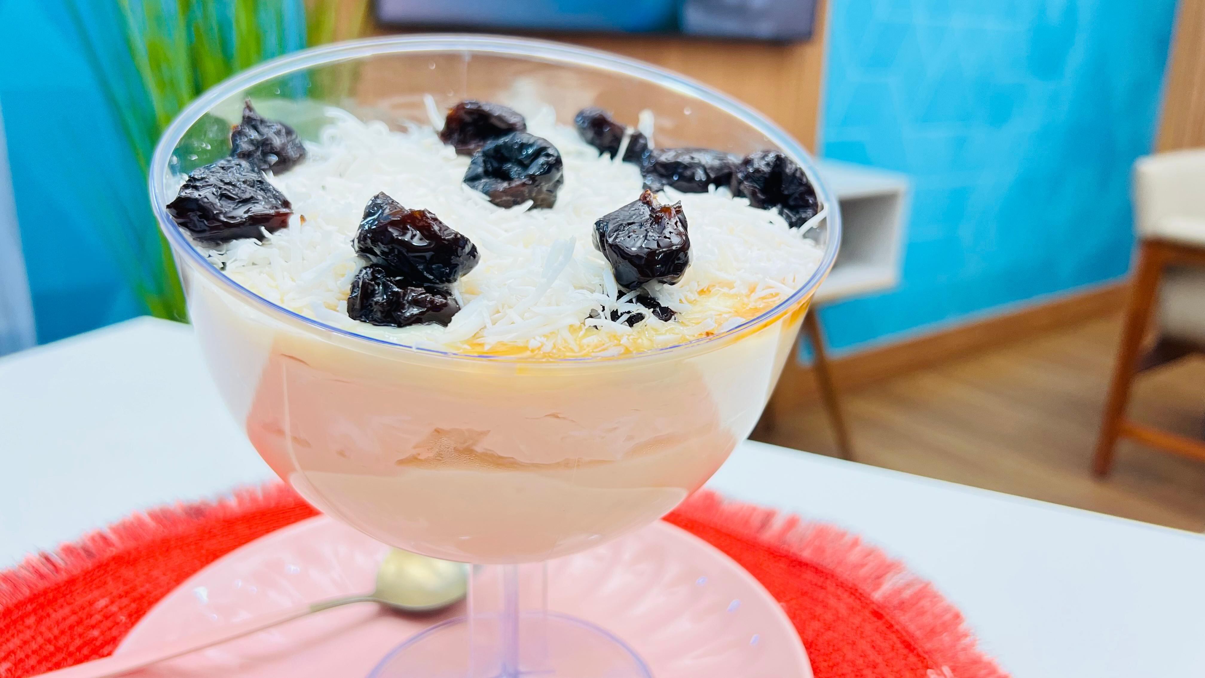 Olho de Sogra na Taça. Foto: Roberta Salgueiro Se você é fã de sobremesas clássicas com um toque de apresentação sofisticada, o Olho de Sogra na Taça vai conquistar seu paladar. Essa versão repaginada do tradicional doce brasileiro aposta na cremosidade, na elegância das camadas e no contraste marcante entre o doce de leite e a ameixa, resultando em uma explosão de sabores a cada colherada.