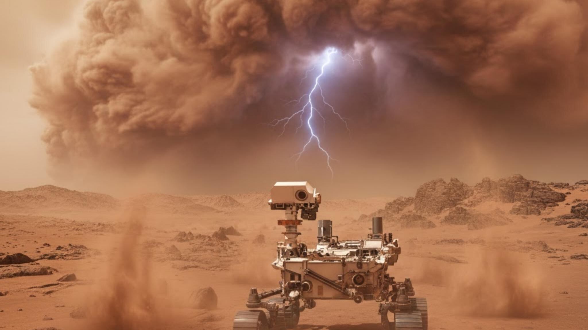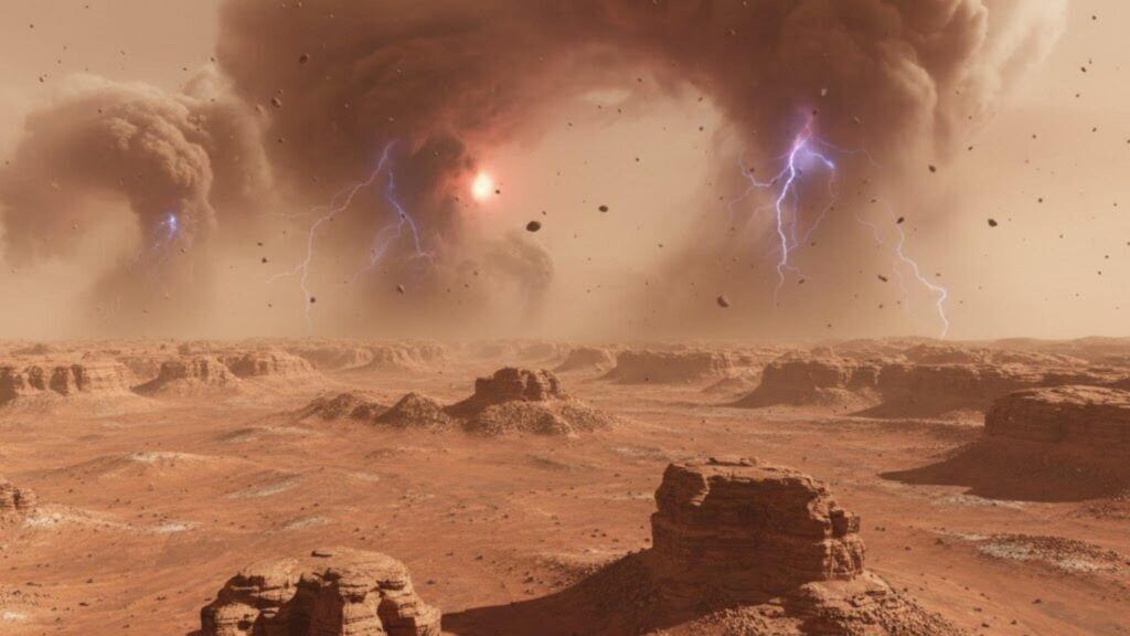 A atmosfera de Marte é marcada por pequenas elevações de poeira, redemoinhos e tempestades que podem atingir escalas globais. A movimentação do vento e o atrito entre partículas de poeira geram eletricidade estática, que é convertida em descargas elétricas, criando uma dinâmica atmosférica complexa. Diferente da Terra, essas descargas não produzem trovões audíveis, mas podem influenciar diretamente a química do ar, tornando-o mais oxidante.