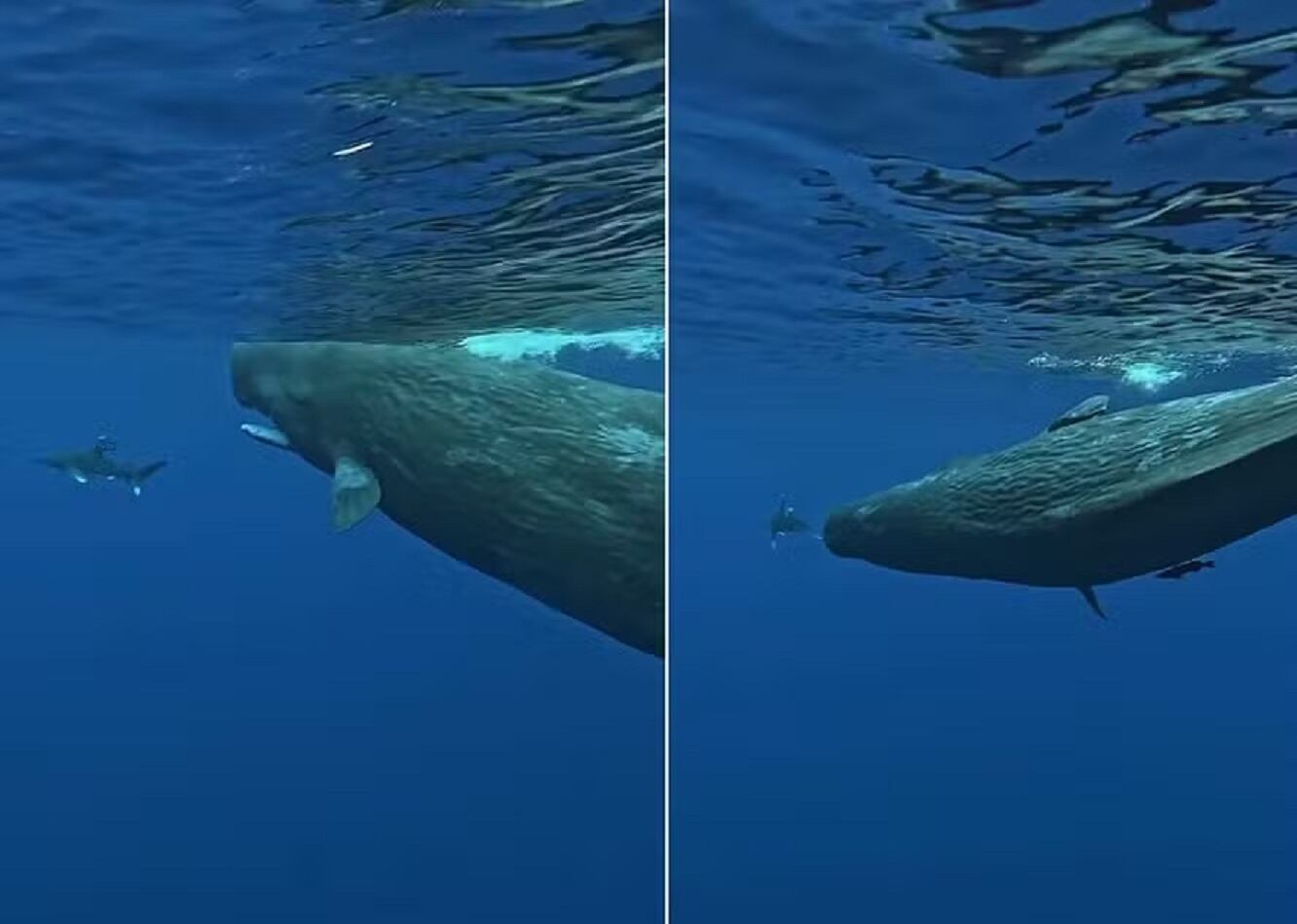 Foi neste momento que uma segunda baleia cachalote apareceu e afastou o tubarão.