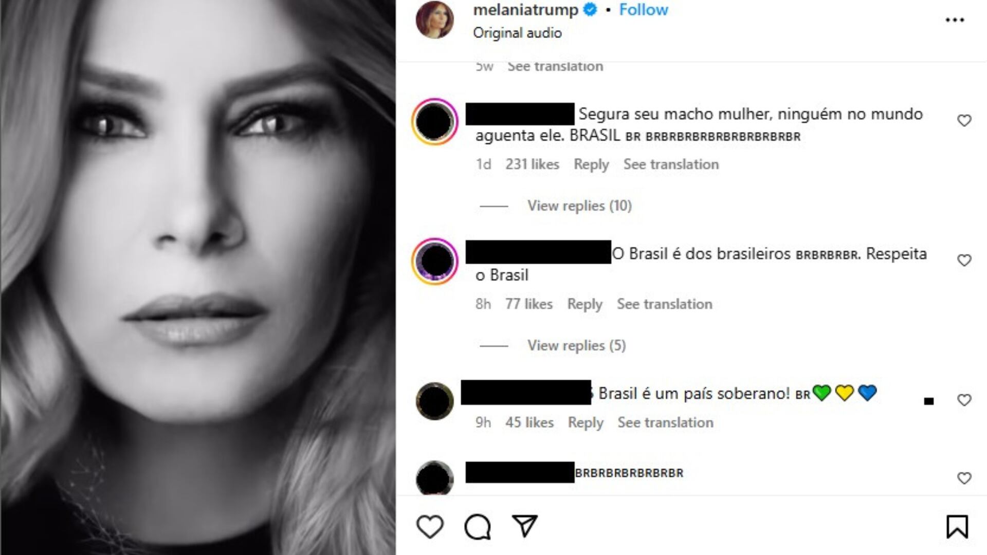 Brasileiros “invadiram” as redes sociais de Melania Trump, primeira-dama dos Estados Unidos, com comentários críticos ao anúncio da aplicação da tarifa de 50% sobre produtos brasileiros exportados ao mercado norte-americano.