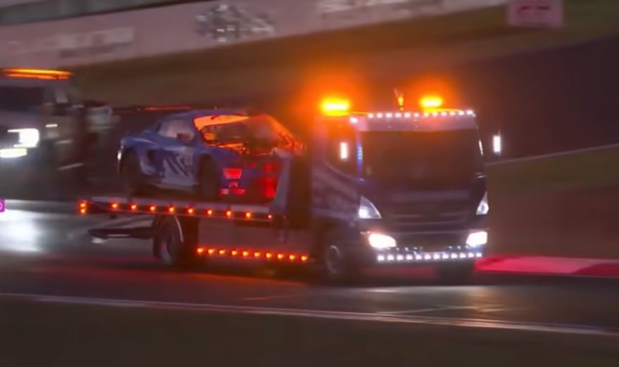 A Mercedes atingiu um dos carros e o impacto levantou o capô, seguido por princípio de incêndio. Com bandeiras amarelas duplas já sendo agitadas no trecho, a direção de prova acionou a bandeira vermelha e interrompeu a disputa.Na sequência, Kai Allen ainda tocou a traseira da Porsche ao tentar desviar. Luca Stolz e Maro Engel conseguiram escapar.