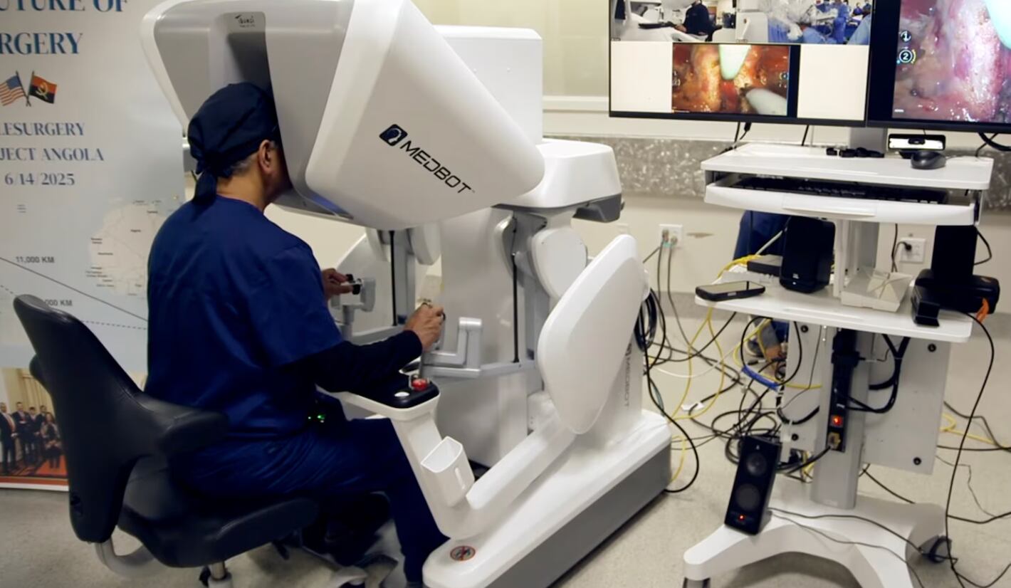 O sistema robótico usado na cirurgia está conectado a diversos locais, como São Paulo, Kuwait, Marrocos, Xangai e a própria Angola, o que possibilita a expansão do atendimento médico global a partir de um único centro.