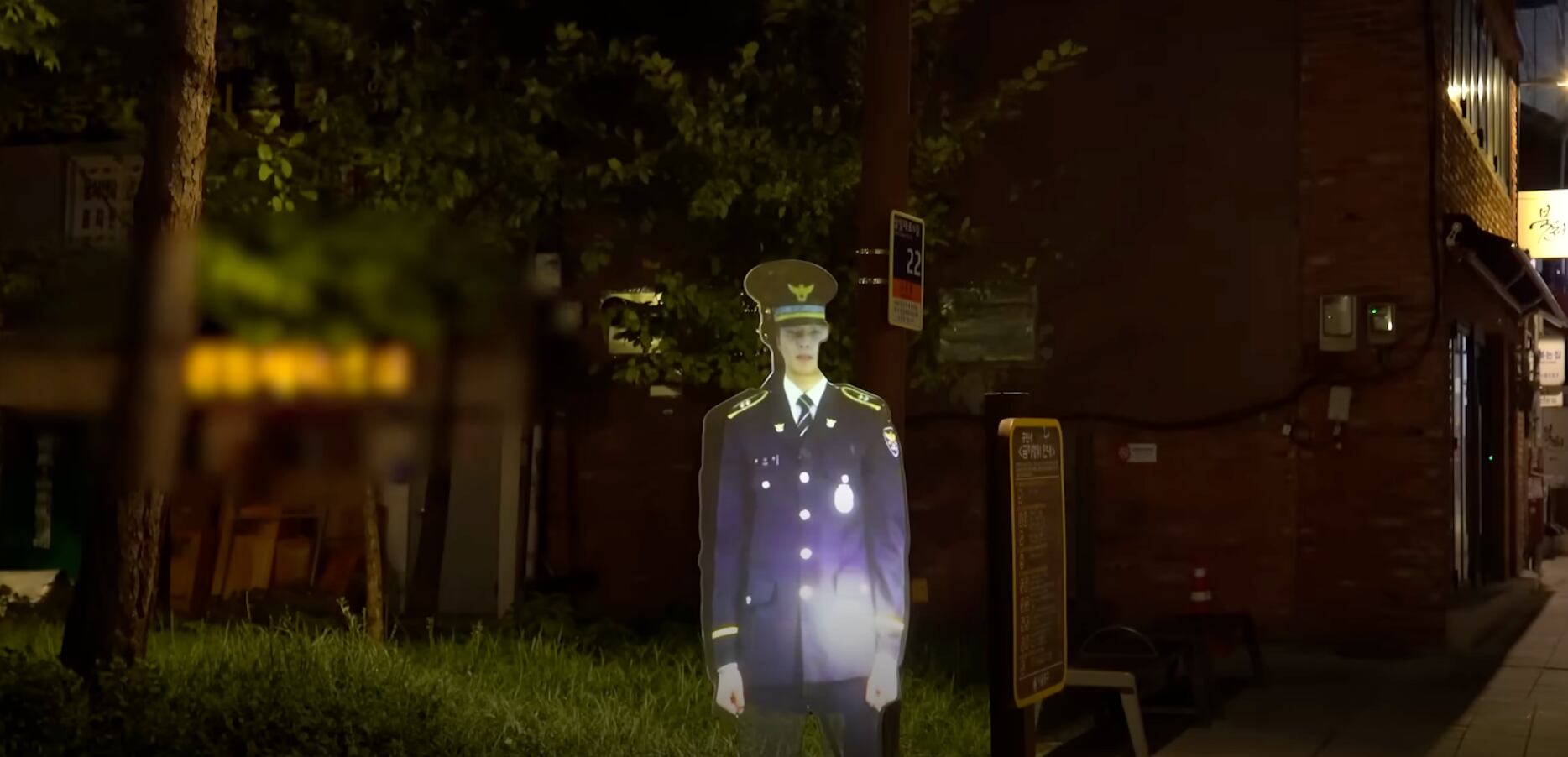 Um policial holográfico em tamanho real está sendo usado em um parque no centro de Seul, a capital da Coreia do Sul, para aumentar a segurança pública e reduzir crimes. E a iniciativa tem funcionado: a criminalidade da área caiu cerca de 22% após a instalação do sistema.
