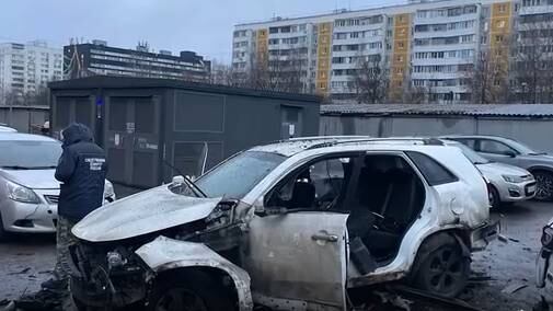 Um vídeo divulgado pela mídia estatal russa mostrou um veículo gravemente danificado em um estacionamento de um bairro de classe média de Moscou.