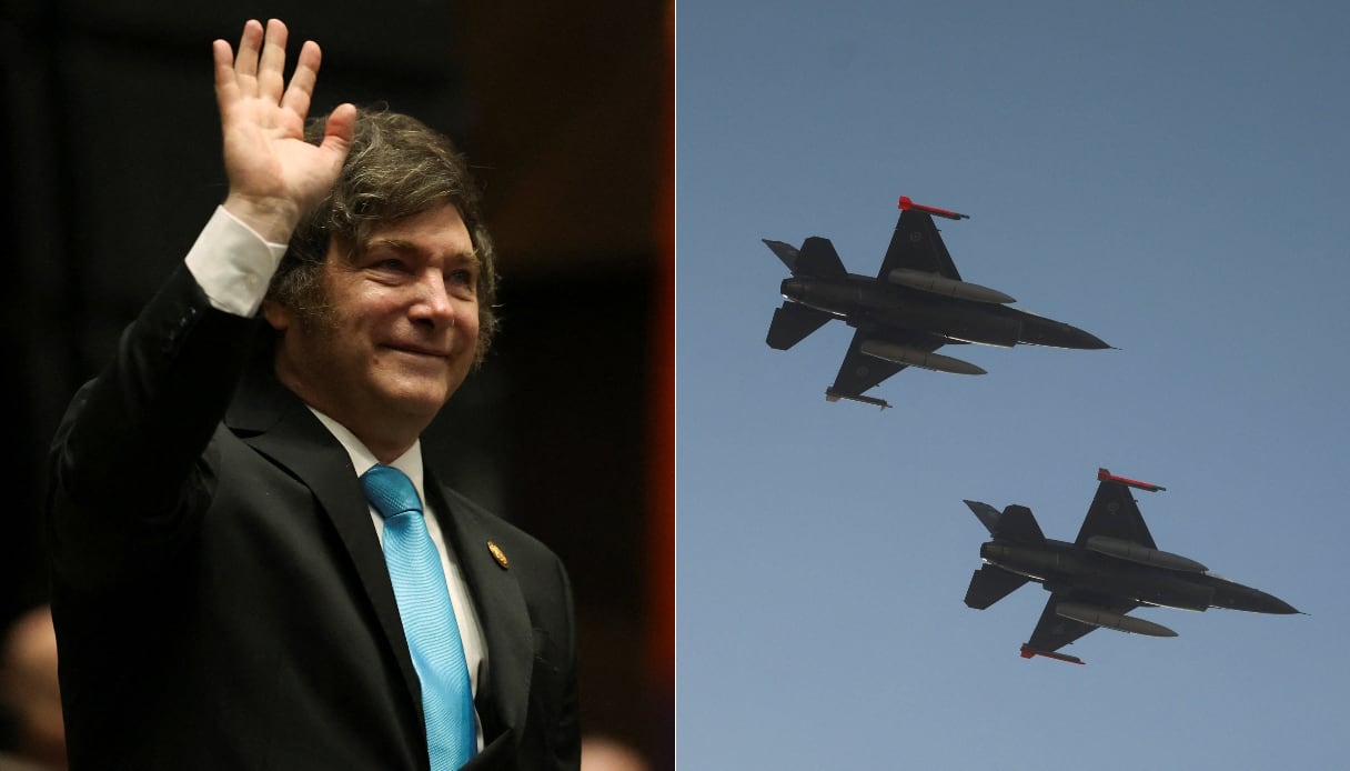 O discurso foi feito na cerimônia de entrega dos primeiros seis caças F-16 que a Argentina comprou da Dinamarca, sob intermediação dos Estados Unidos. O evento ocorreu em Córdoba, no interior do país Montagem/Luis Gandarillas/Reuters – 08.11.2025 e Cristina Sille/Reuters – 06.12.2025