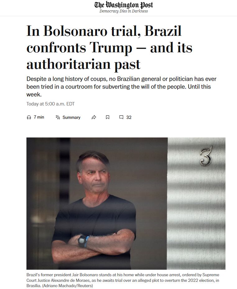 A publicação elogiou a investigação brasileira como uma “lição de maturidade democrática” e destacou que o julgamento é histórico, sendo a primeira vez que um ex-presidente brasileiro é julgado por tentativa de golpe.