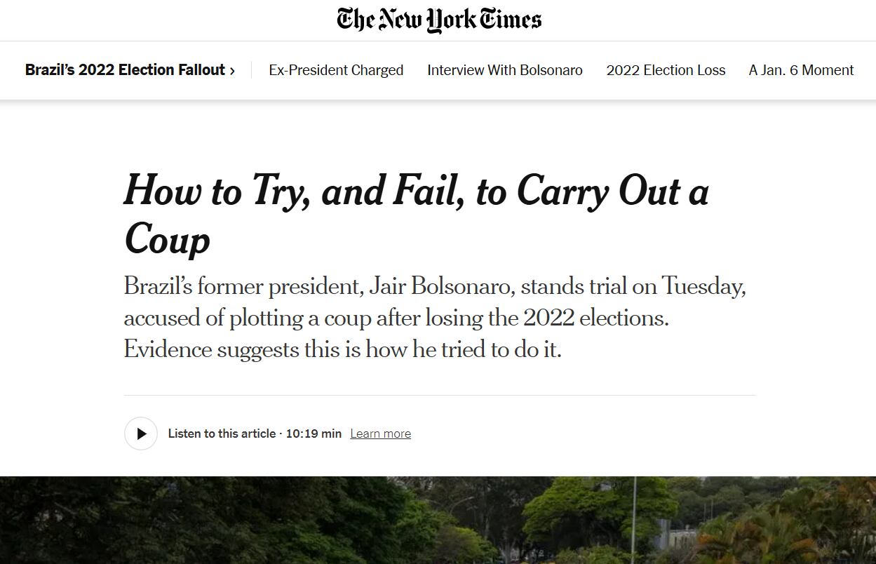 O jornal comparou o caso à tentativa de Donald Trump de se manter no poder nos EUA após 2020, acrescentando que o Brasil está conseguindo levar um ex-presidente a julgamento, algo que os EUA não fizeram.