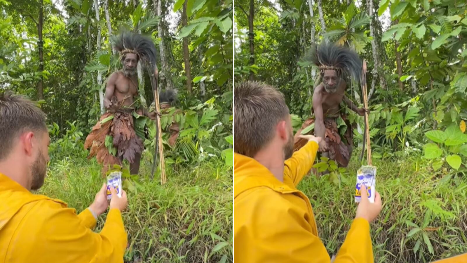 No vídeo, Dara Tah, acompanhado por um guia local chamado Demi, tenta oferecer sal como um gesto de paz. Um dos membros da tribo, vestindo uma tanga de folhas, prova o sal, mas depois cospe e ergue o arco novamente. Tah, visivelmente nervoso, comenta sobre a reação do membro da tribo, enquanto o guia alerta que eles não são bem-vindos e que a situação é perigosa.