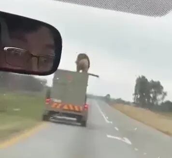 Leão escapa, pula do teto de caminhão e anda em estrada na África do Sul