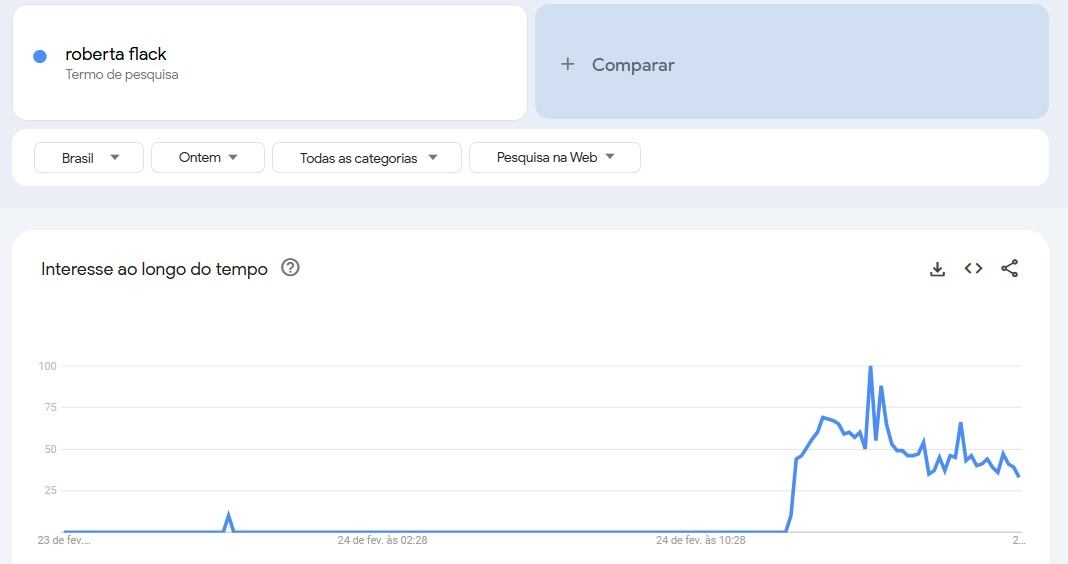 O pico de buscas foi registrado às 14h44. Os cinco estados que mais buscaram pelo termo “Roberta Flack” foram: Rio de Janeiro, São Paulo, Distrito Federal, Rio Grande do Sul e Minas Gerais, nesta ordem, apontou o Google Trends.