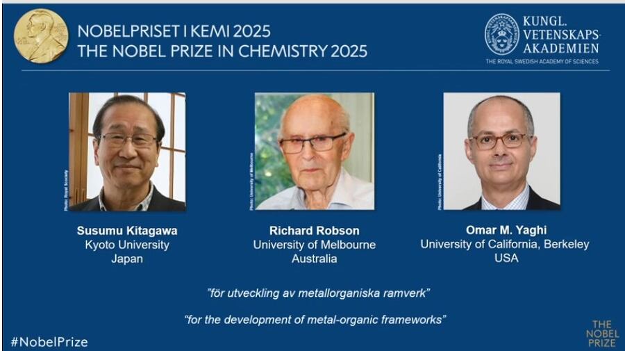 A Real Academia Sueca de Ciências concedeu o Prêmio Nobel de Química de 2025 aos cientistas Susumu Kitagawa, Richard Robson e Omar M. Yaghi pelo desenvolvimento de estruturas metal-orgânicas. O prêmio dessa categoria teve 116 edições desde 1901.
