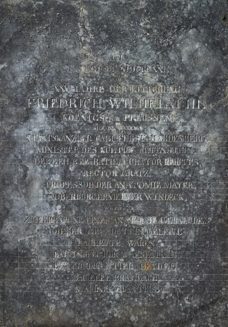 A inscrição registrava a cerimônia de assentamento da pedra fundamental e mencionava figuras como o Chanceler Carl Fürst Hardenberg, o Ministro Altenstein, o Reitor Gratz, o Professor de Anatomia Mayer e o Prefeito Windeck.