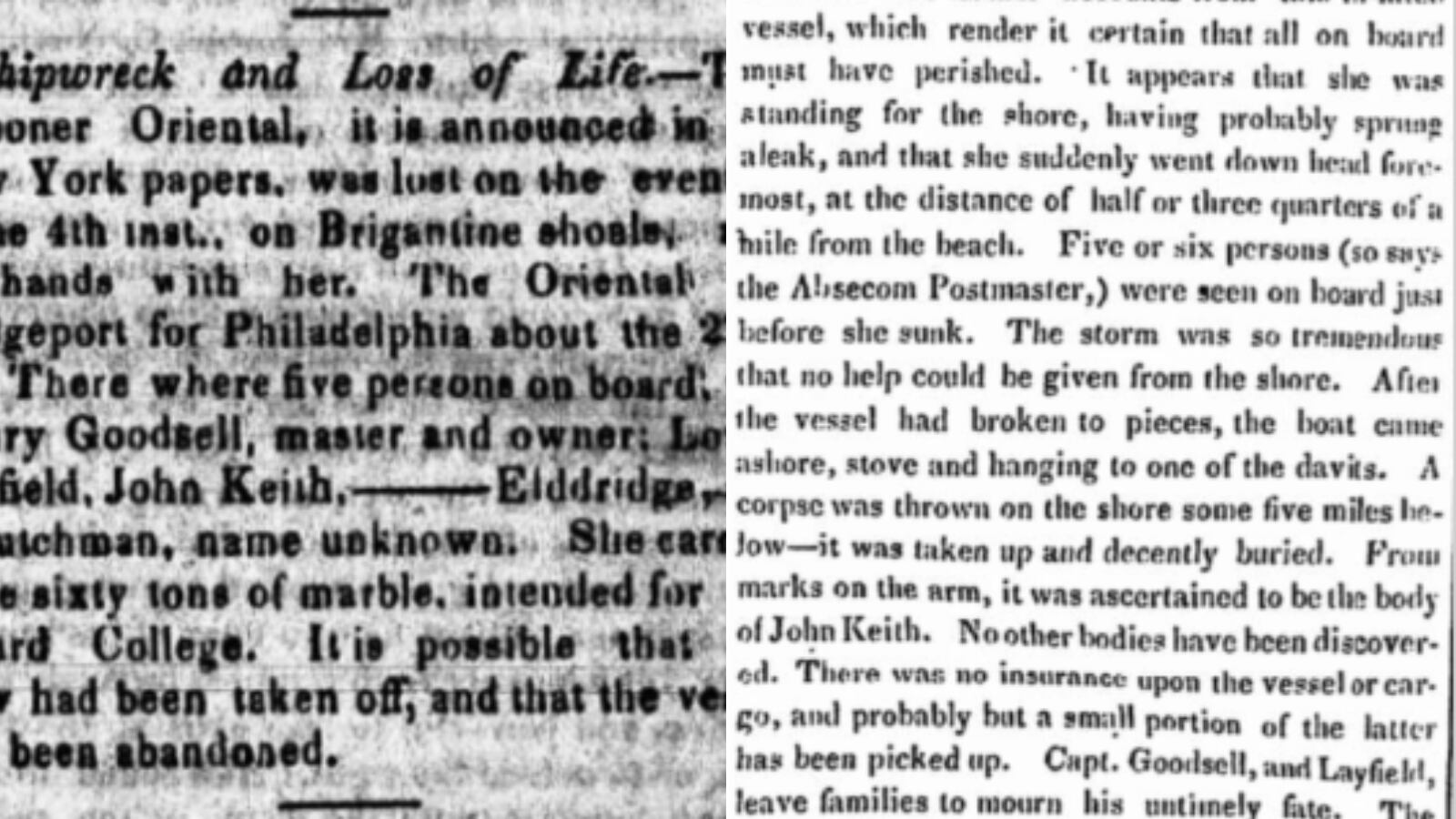 A pesquisa também revelou detalhes do naufrágio da escuna Oriental. Em 1844, o navio, que transportava 60 toneladas de mármore de Connecticut para o Girard College, na Filadélfia, sofreu um vazamento e afundou a menos de 1,6 km da costa de Brigantine Shoal, matando todos os cinco tripulantes a bordo, incluindo Goodsell.