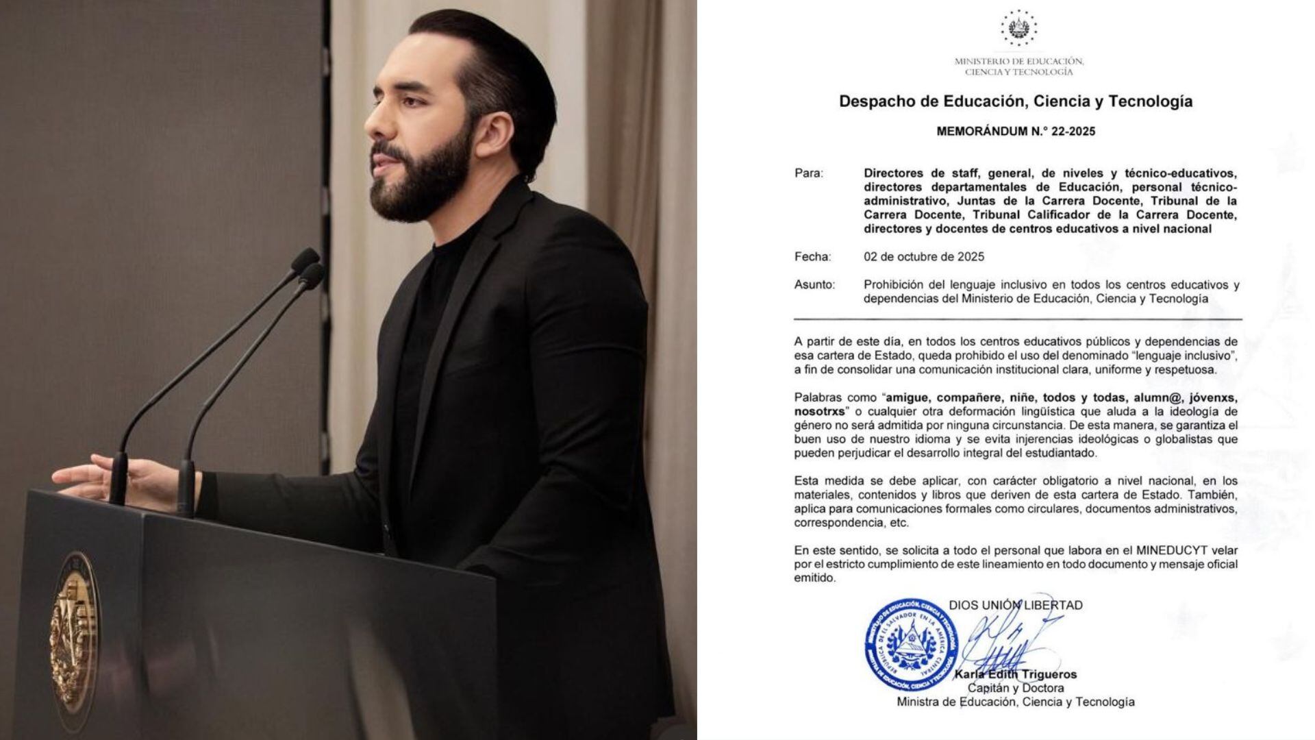 “A partir de hoje, fica proibido o chamado ‘linguagem inclusiva’ em todos os centros educacionais públicos do nosso país”, escreveu Bukele em publicação nas redes sociais.