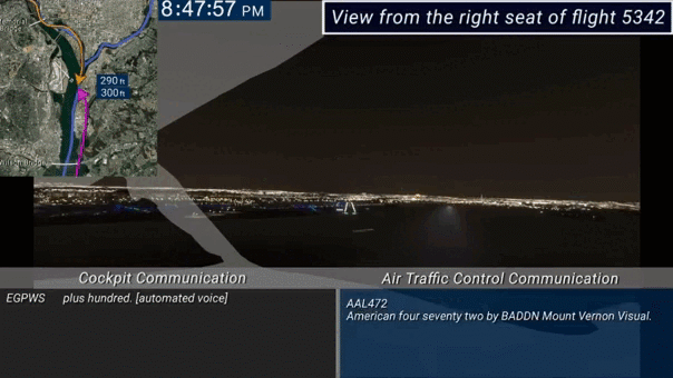 A simulação do NTSB (Conselho Nacional de Segurança nos Transporte) mostra a visão prejudicada de dentro da cabine do avião momentos antes da batida com o helicóptero.
