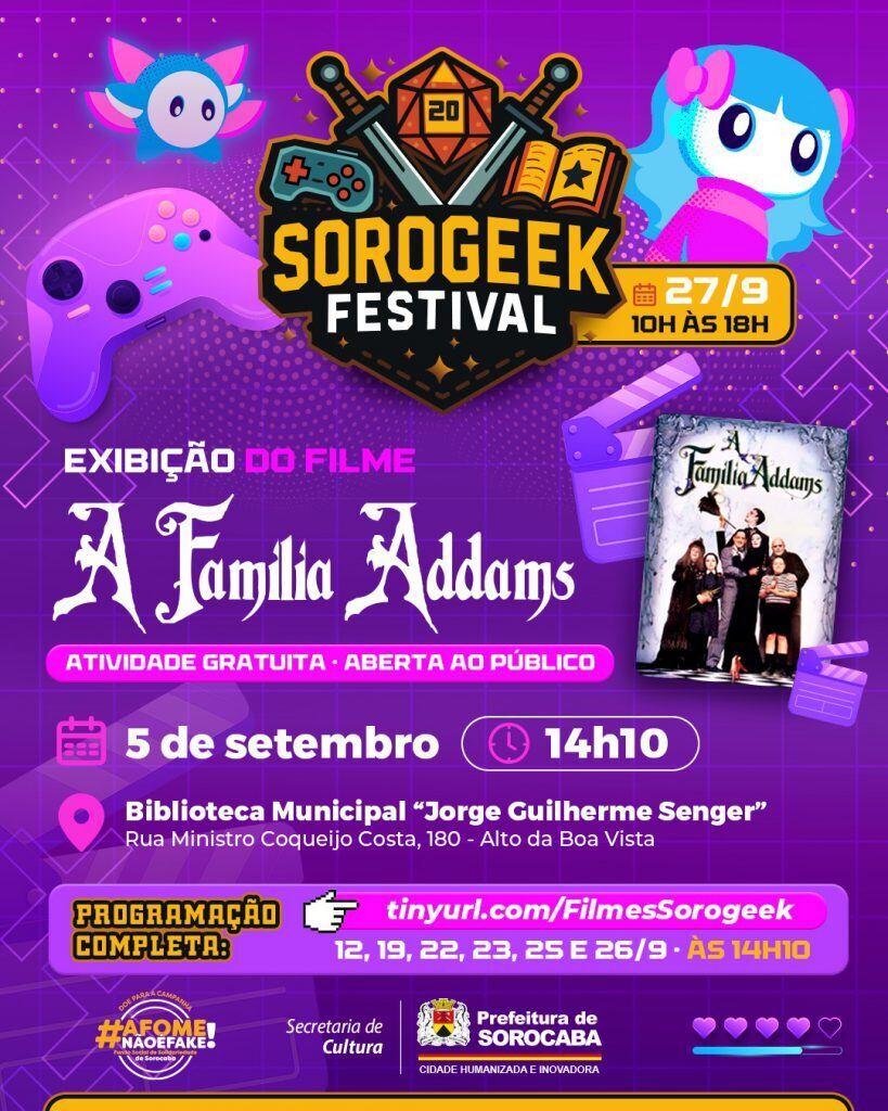 Foto: Prefeitura de SorocabaA população contará com uma programação especial de filmes preparada para a 1ª edição do “SoroGeek Festival”. As exibições gratuitas têm início na próxima sexta-feira (5), às 14h10, no auditório da Biblioteca Municipal “Jorge Guilherme Senger”, com o filme “A Família Addams” (1991), com direção de Barry Sonnenfeld.