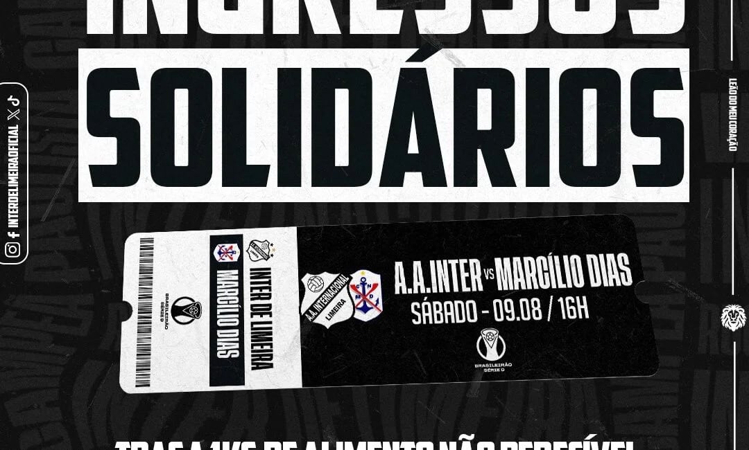 Foto: Reprodução/Inter de LimeiraA Associação Atlética Internacional anunciou nesta terça-feira (6) uma ação solidária especial voltada à torcida para o importante confronto do próximo sábado (9), contra o Marcílio Dias, pela segunda fase do Campeonato Brasileiro Série D. Através da promoção de ingresso solidário, o torcedor que doar 1 kg fechado de alimento não perecível poderá adquirir ingresso com valor de meia-entrada em qualquer setor do Limeirão, incentivando a solidariedade e o engajamento da torcida com o clube e com causas sociais.