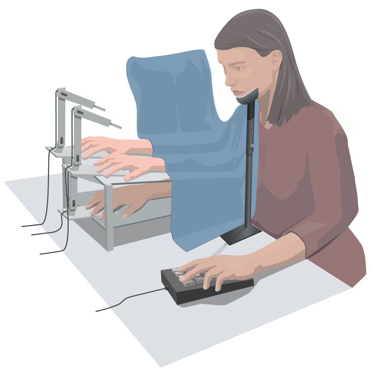 Criamos uma configuração robótica que nos permitiu controlar essa ilusão com precisão de milissegundos. Em nosso experimento principal, 32 participantes viram duas mãos de borracha lado a lado, enquanto um robô tocava sua mão real, escondida.