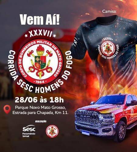 O Corpo de Bombeiros Militar de Mato Grosso (CBMMT) abriu as inscrições para a 37ª edição da Corrida Sesc Homens do Fogo. O evento será realizado no dia 26 de junho, às 18h, no Parque Novo Mato Grosso, em Cuiabá, e é realizado em parceria com o Sesc Mato Grosso.