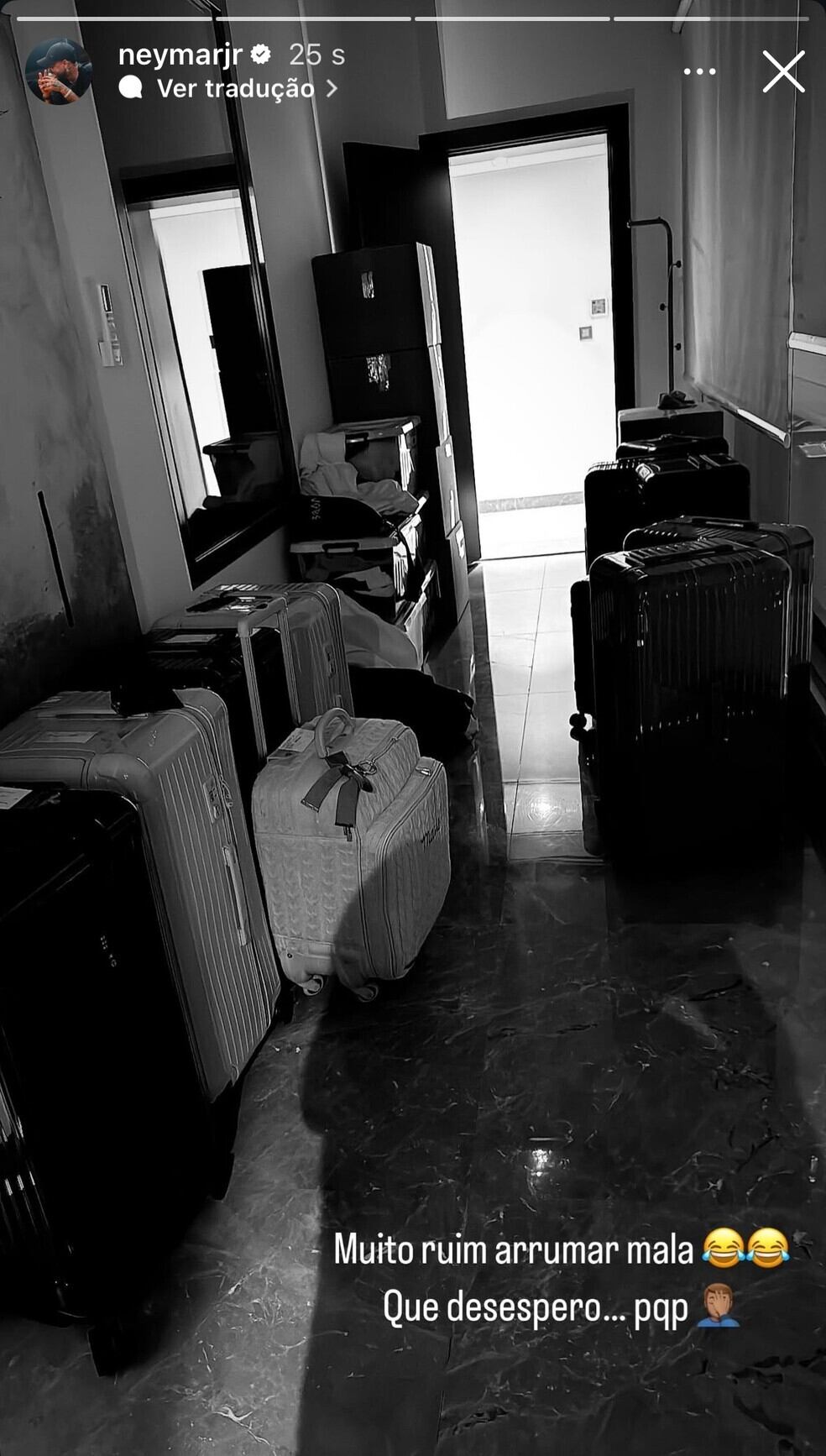 Neymar usou as redes sociais para mostrar sua tristeza ao deixar a Arábia Saudita nesta terça-feira (28). O jogador, que encerrou recentemente o contrato com o Al-Hilal, postou foto de seu corredor lotado de malas, com as mudanças para o retorno ao Brasil. Na legenda da publicação, ainda lamentou o momento de despedida e de arrumação das coisas. “Muito ruim arrumar a mala. Que desespero”, disse.