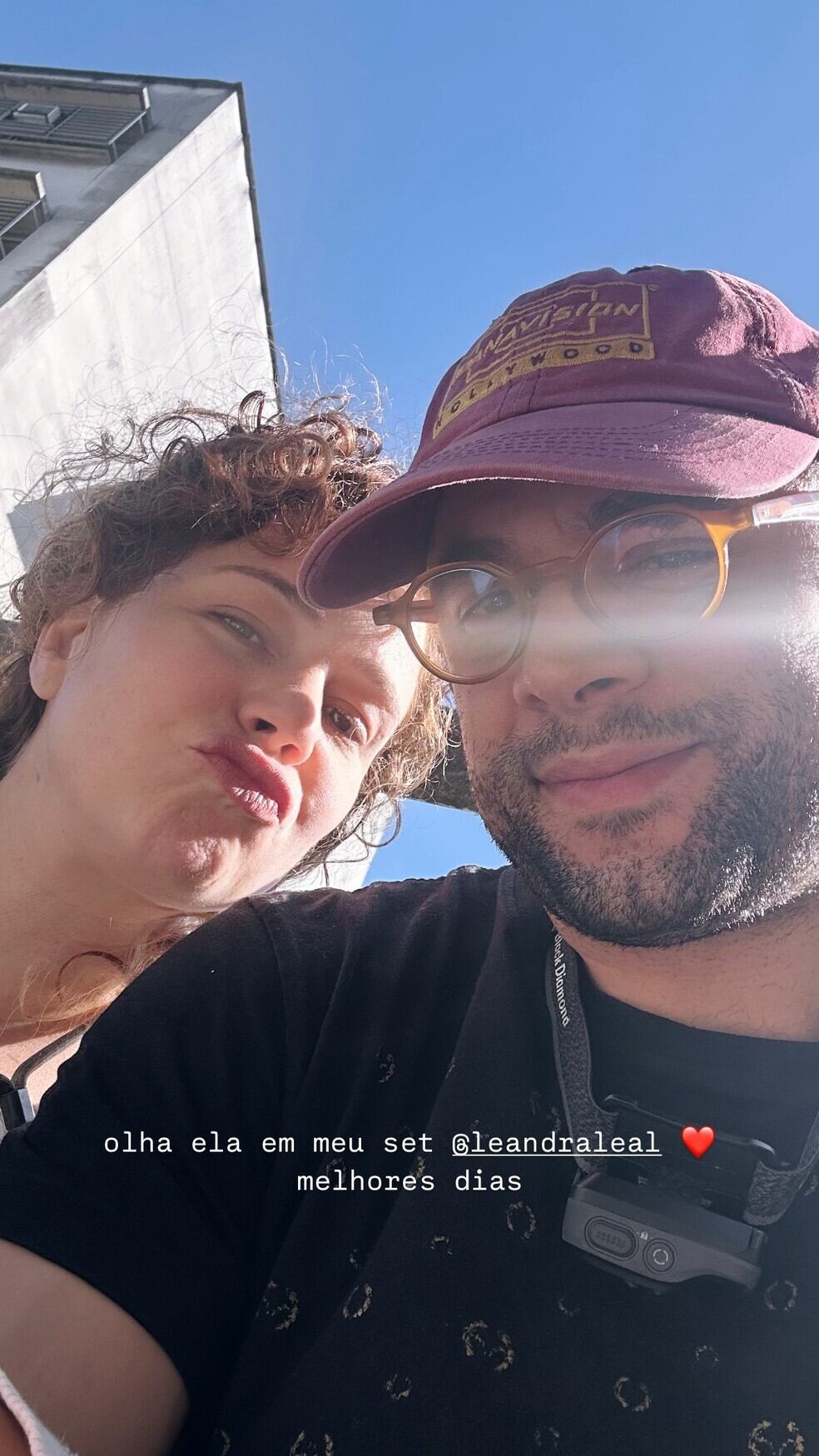 O cineasta Guilherme Burgos, de 35 anos, postou em seu Instagram, na quinta-feira (19), uma foto rara com a esposa, a atriz e diretora Leandra Leal, de 42 anos. No registro, o casal aparece de rostinho colado em um dia de trabalho do diretor, que ficou feliz da vida pela presença da amada no set de filmagem.