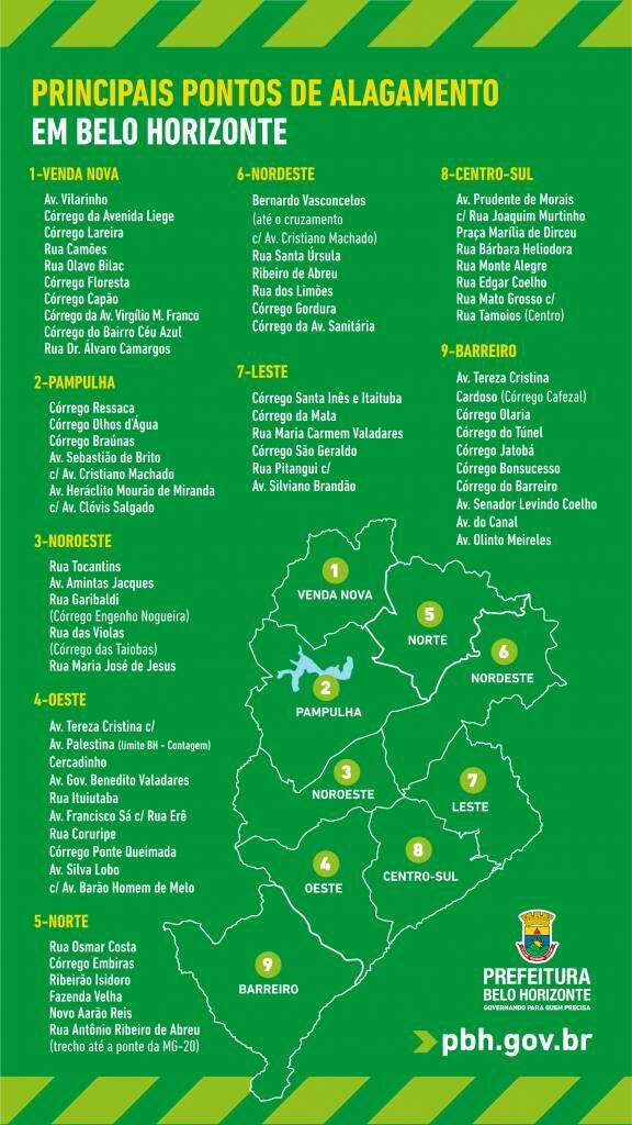 Atualmente, Belo Horizonte tem 62 pontos com risco provável de alagamento em caso de temporais (veja a lista abaixo). O mapeamento foi feito pela prefeitura para facilitar a realização de ações emergenciais. Em casos de cheias de córregos, a Defesa Civil bloqueia algumas áreas.