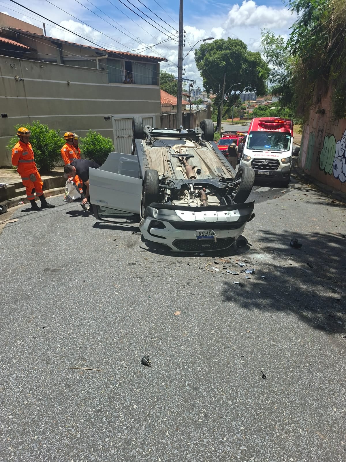 Carro capota e cai de altura de 5 metros após motorista tentar ajustar cadeirinha de bebê em BH