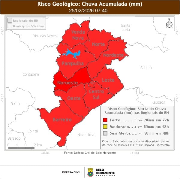 A Defesa Civil de Belo Horizonte emitiu, nesta quarta-feira (25), alerta de risco geológico forte em todas as regionais da capital mineira. O aviso é válido até a próxima segunda-feira (2) e foi motivado pelo alto volume de chuvas registrado nas últimas horas, além da previsão de novos temporais nos próximos dias.