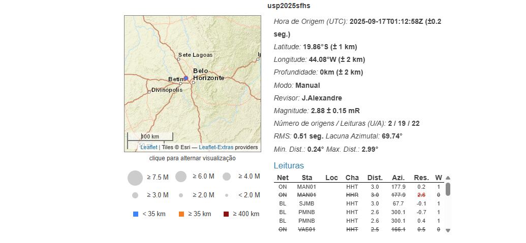 Segundo o Centro de Sismologia da USP, às 22h12, o primeiro tremor foi registrado com epicentro em Contagem, na Grande BH, de magnitude 2.9 na escala Richter. Outro tremor foi registrado, na mesma cidade, com magnitude 2.5 na escala Richter.