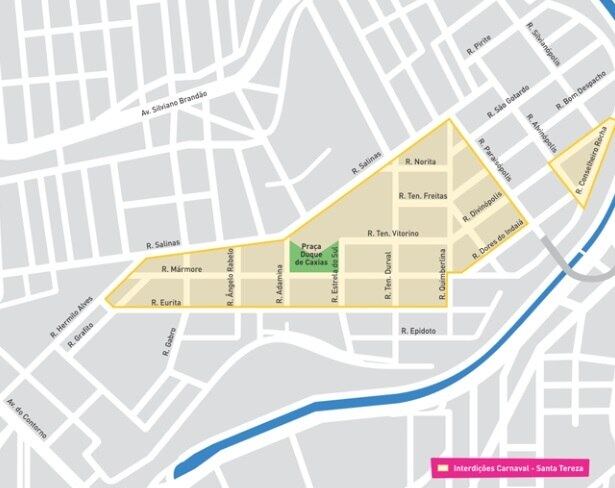 O bairro Santa Tereza, na região Leste, terá o trânsito interditado durante todos os dias do Carnaval, no entorno da praça Duque de Caxias, entre 9h e 19h. Nass áreas de desfiles dos blocos, delimitada pelas ruas Salinas, Hermilo Alves, Eurita, Quimberlita e Paraisópolis o carros e ônibus não poderão circular. Será permitido o trânsito local dos moradores e comerciantes.