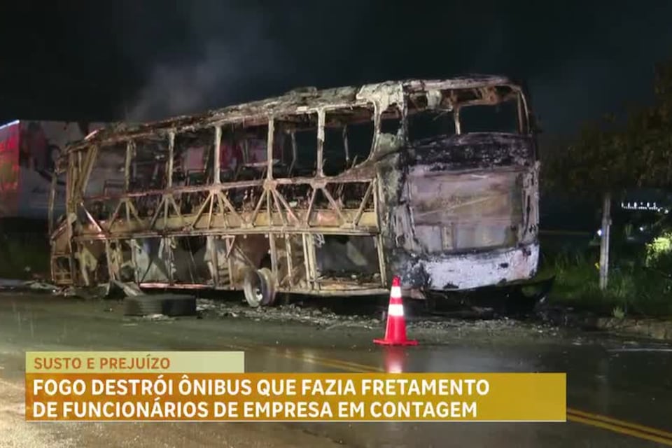 Fogo destrói ônibus que fazia fretamento de funcionários de empresa em Contagem, na Grande BH