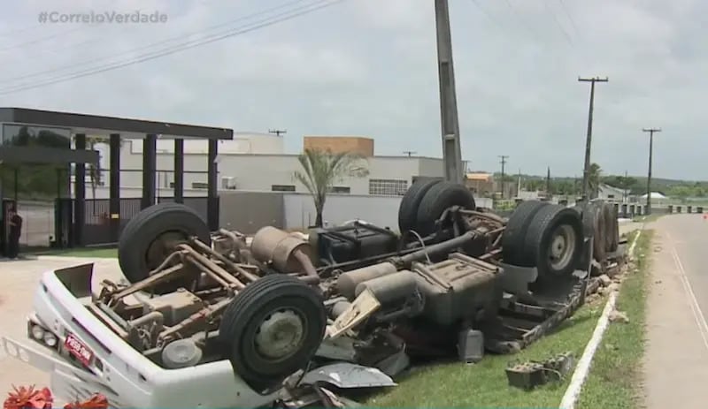 Segundo informações preliminares, uma cinta que prendia a carga se rompeu, fazendo com que as manilhas caíssem e provocando o tombamento da carreta, que ainda colidiu contra um poste.