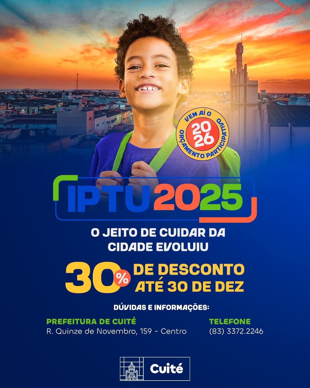 A Prefeitura de Cuité iniciou a campanha do IPTU 2025, oferecendo 30% de desconto para os contribuintes que efetuarem o pagamento até 30 de dezembro. A iniciativa busca estimular a regularização em dia e fortalecer os investimentos municipais. A gestão também anunciou a implantação do Orçamento Participativo a partir de 2026, mecanismo que vai permitir que o recurso do IPTU seja aplicado de acordo com a prioridade elencada pela população.
