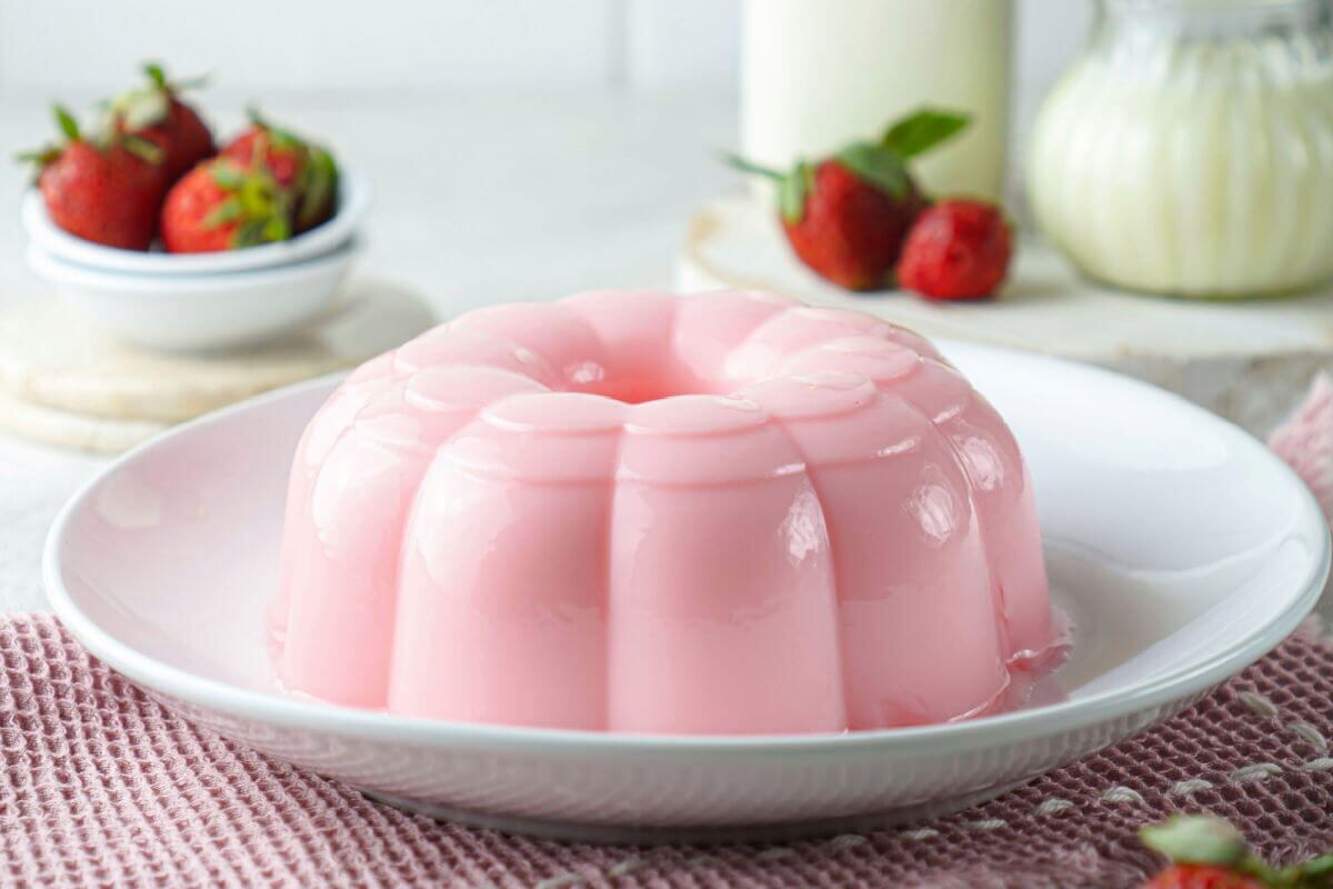 Em um liquidificador, coloque a água fervente e a gelatina de morango. Bata até dissolver. Acrescente os demais ingredientes e bata até obter uma mistura homogênea. Despeje a misture em uma forma para pudim untada com óleo de coco. Leve à geladeira por 3 horas. Desenforme e sirva.