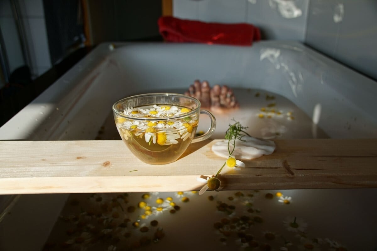 1. Banho de camomila para relaxar e acalmar a mente