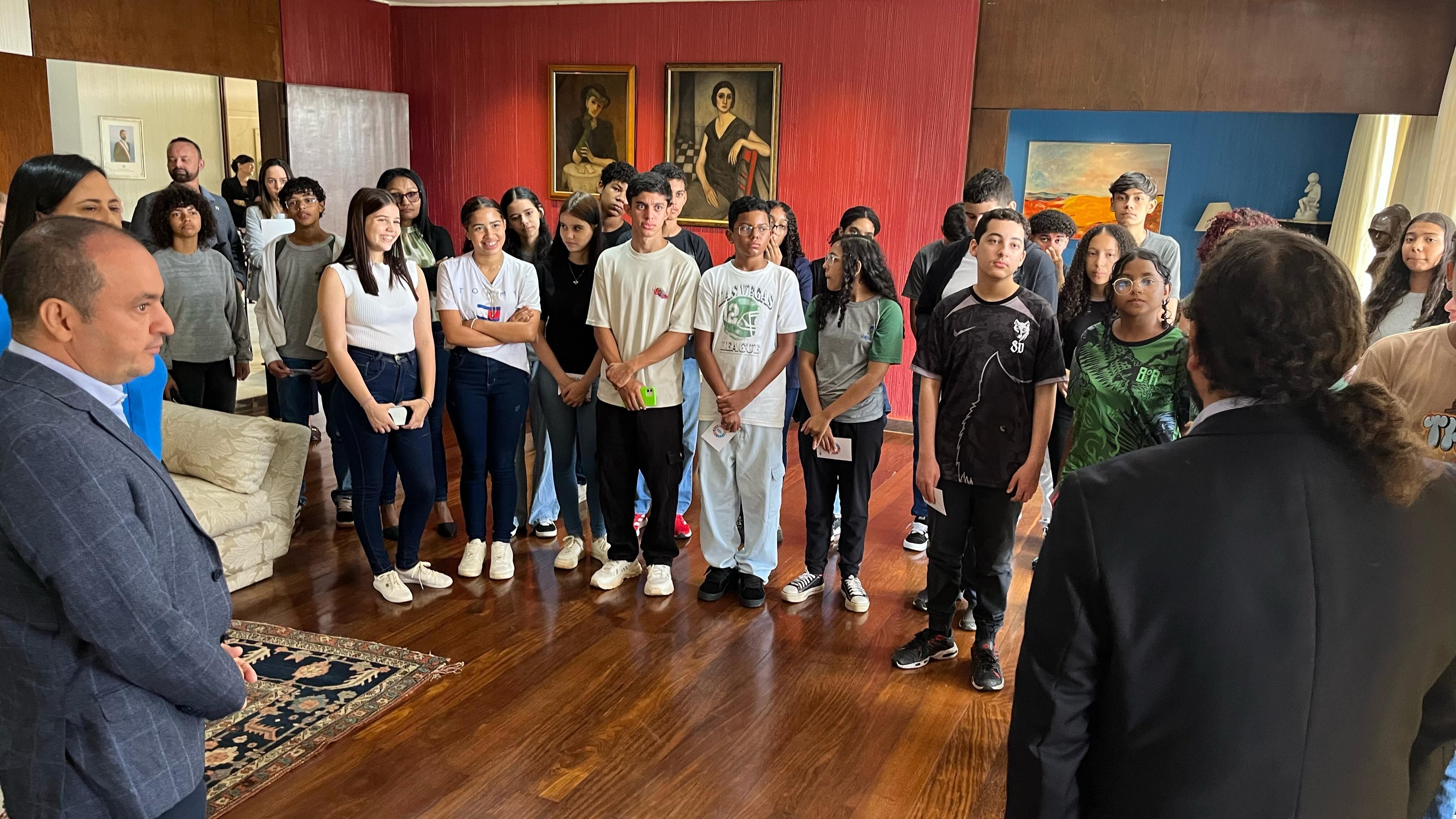 Os estudantes se depararam com um espaço um tanto quanto diferente. Durante a visita guiada, aprenderam a história do país, coleções de arte, tapeçarias e artefatos históricos mantidos pelo corpo diplomático.