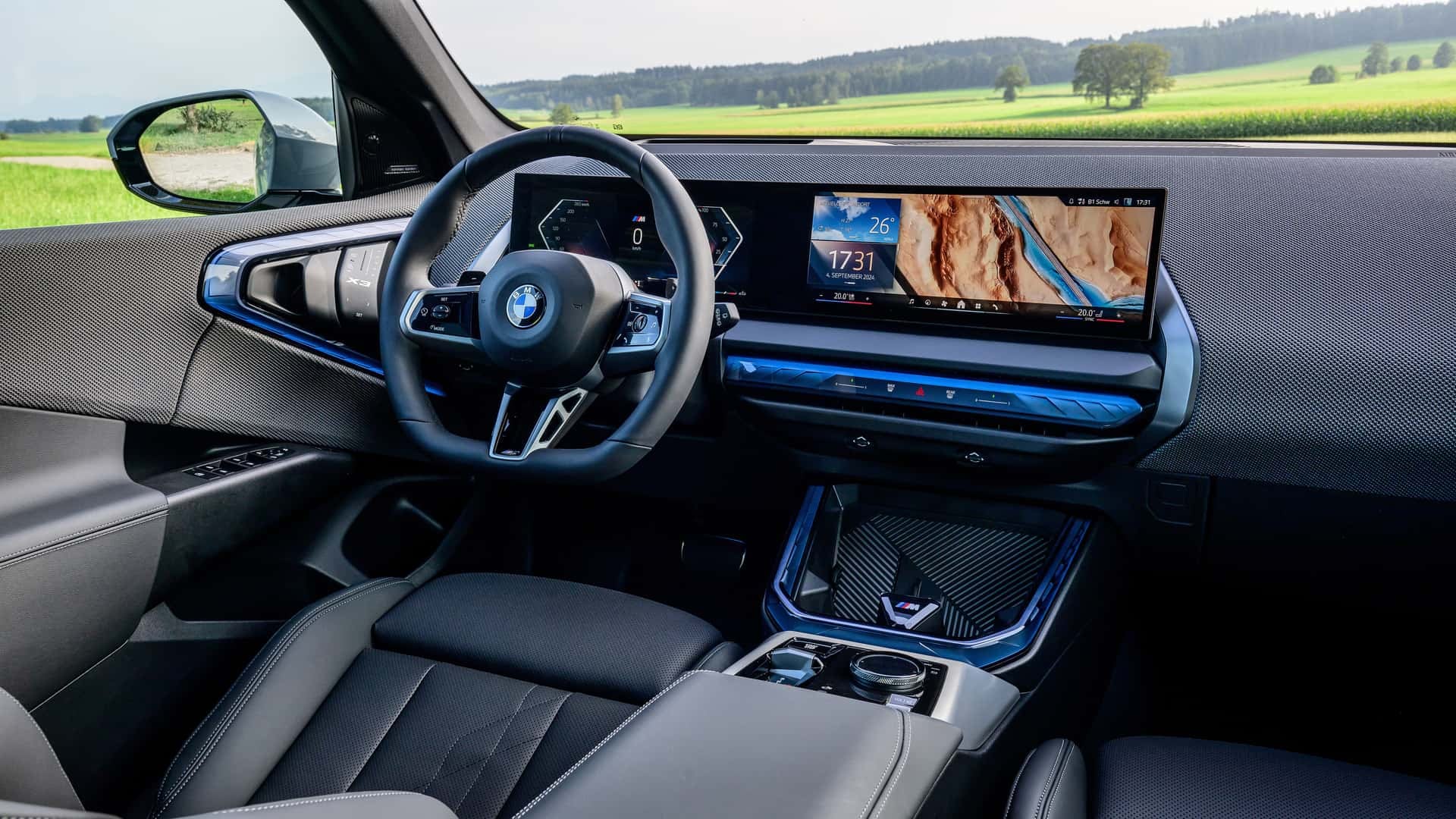 Entre os diferenciais visuais, a versão M Sport adota grade com iluminação BMW Iconic Glow. O interior segue o padrão premium da marca, equipado com teto solar panorâmico, painel curvo BMW Curved Display (12,3” + 14,9”), Interaction Bar, volante esportivo e nova alavanca de câmbio.