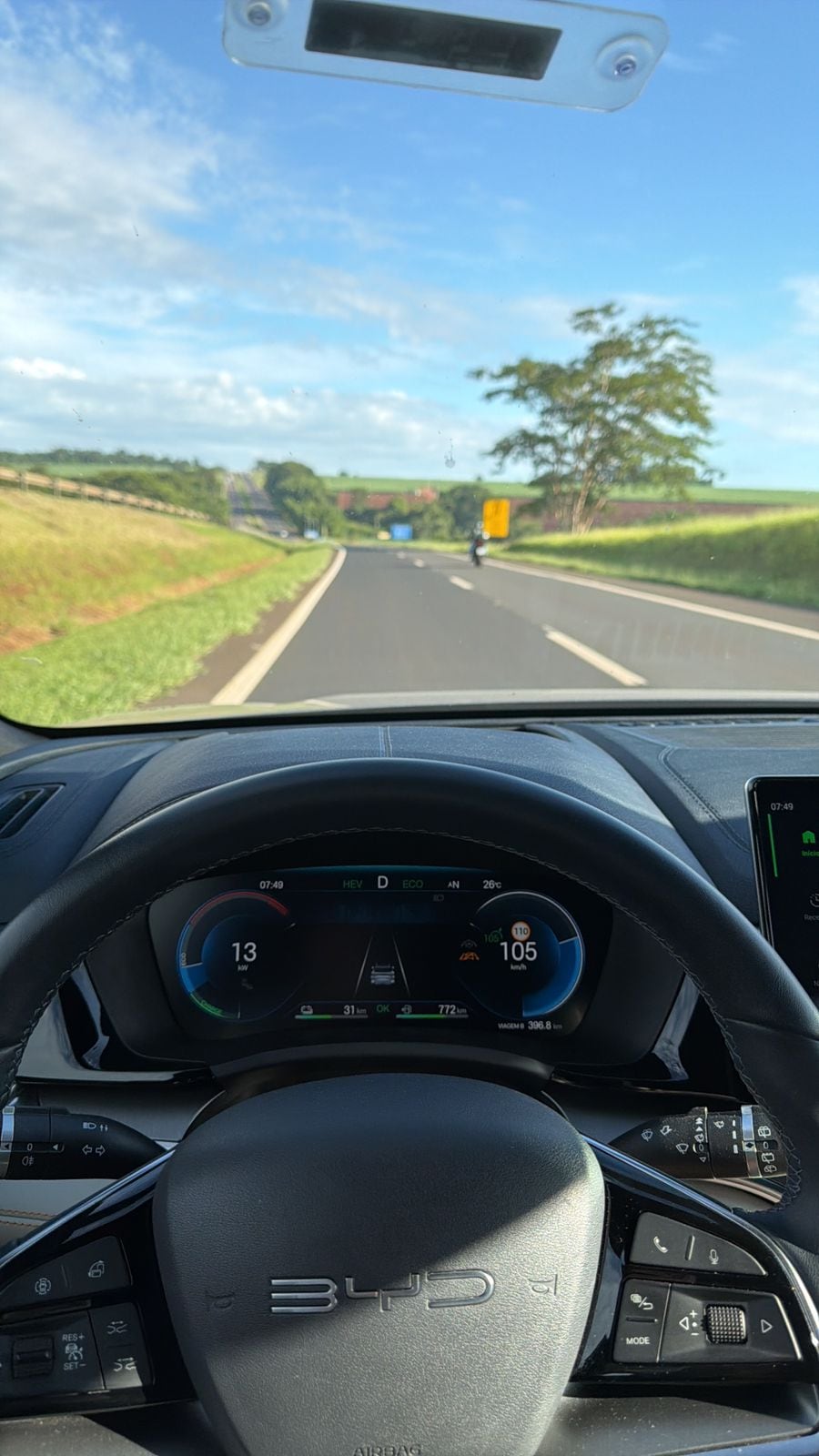 Iniciamos o teste do Song Plus 2026 com 100% da bateria carregada e tanque cheio onde o SUV marca “1.100km de autonomia”. Usamos o carro um pouco em São Paulo somente no modo elétrico rodando 70km. Depois iniciamos a viagem rumo à Olímpia (450km) onde o hodômetro marcava 1.088km de autonomia e 21km de bateria (cerca de 20%) pelas rodovias Bandeirantes, Anhanguera e Washington Luís. Sem nenhum trânsito ou lentidão a viagem feita usando o controle de cruzeiro adaptativo por 5h30 permitiu chegar ao destino com 536km de autonomia e 7km nas baterias.