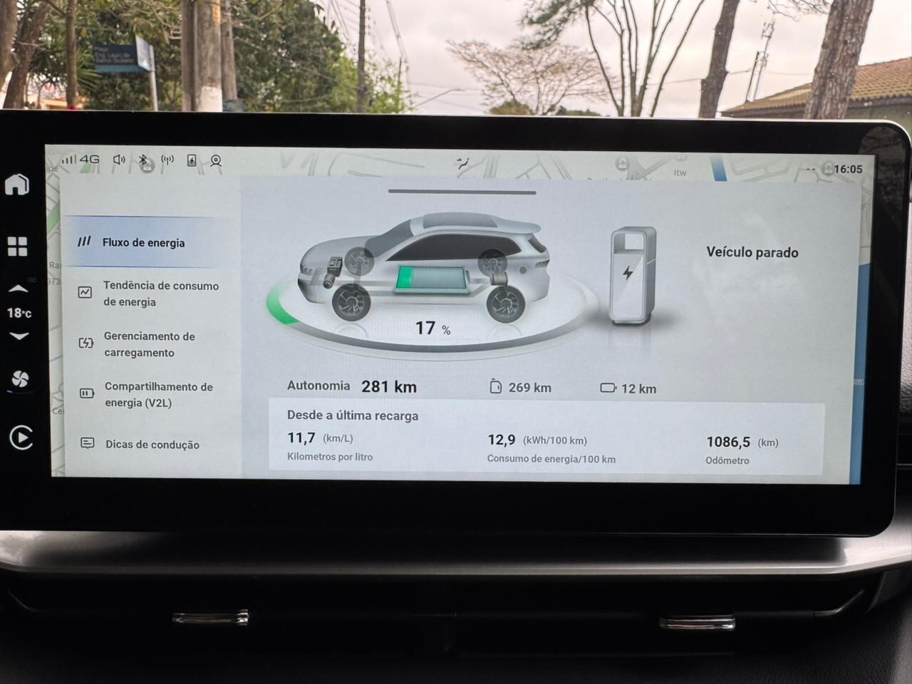 Há duas amplas telas de comandos bem completos e também uma gestão de energia fácil de mexer assim como níveis de frenagem, regeneração, modos de condução e tudo que for possível ajustar. As telas trazem com exatidão números sobre consumo, pressão de pneus, fonte da multimídia entre outros itens, no entanto, os comandos são um pouco pequenos para serem vistos à distância, algo que poderia ser melhor.