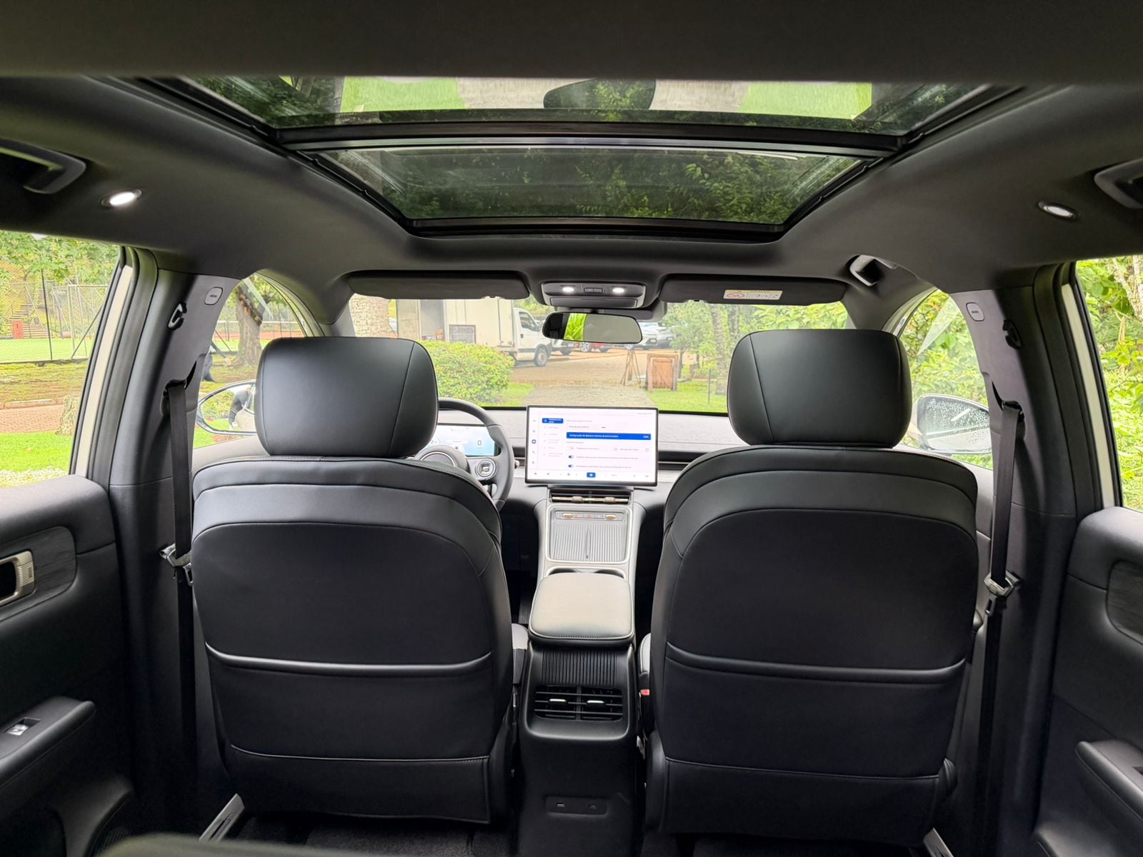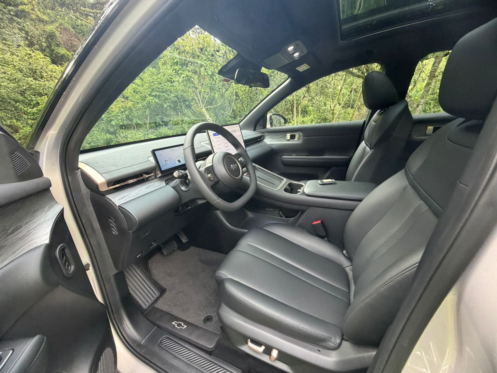 O interior mantém o padrão dos veículos chineses, pois conta com painel limpo, central multimídia flutuante de 15” e painel de instrumentos digital de 8,8”. A multimídia não usa sistema MyLink e o espelhamento exige fio mas a conexão é feita só no caso USB-A. O USB-C é apenas para carga. No console central há um espaço para dois celulares que no Captiva EV poderia ser um carregador de indução. Mas não é.