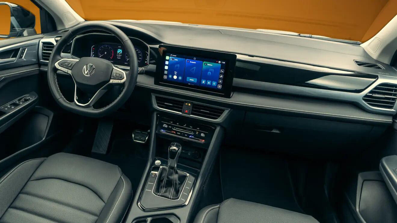 Por dentro, o Volkswagen Taos 2026 recebeu o mesmo padrão visual visto no Jetta reestilizado. O painel tem novo desenho com multimídia flutuante, quadro de instrumentos digital atualizado e novos difusores de ar.
